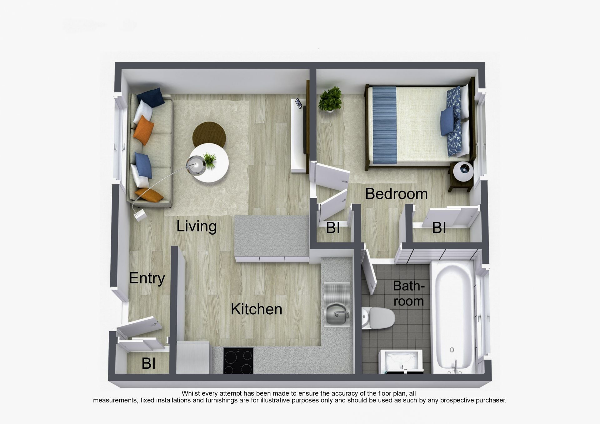 • Stylish Interiors: Sleek design with a bright, airy layout. Open living/dining area (34m²) and sunlit bedroom with built-in mirrored wardrobes.