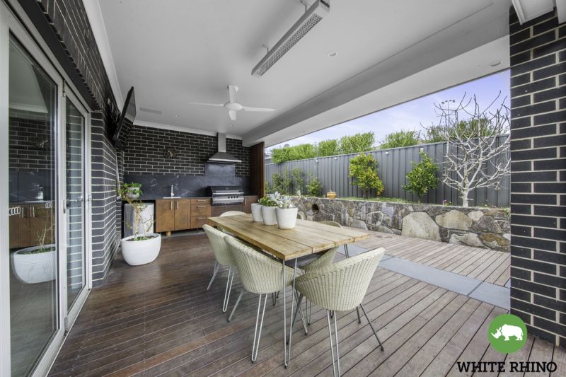 The alfresco links seamlessly to the living via bifold doors perfect for entertaining. It features a ceiling fan, space heater, speakers, outdoor kitchen with bar fridge, sink, rangehood & a Ziegler & Brown Bbq.