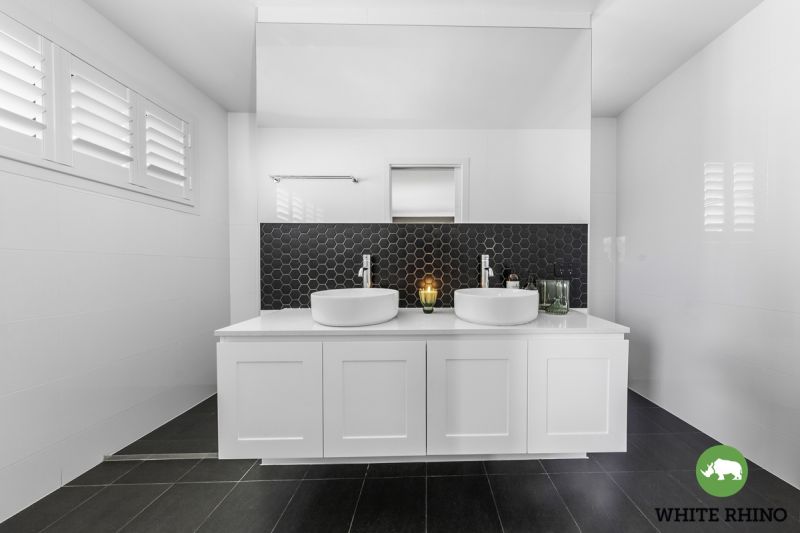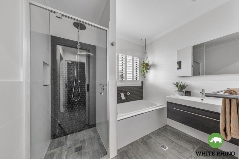 Upstairs, the master suite offers a private and light-filled parents' retreat, complete with a walk-in wardrobe and a luxurious ensuite. The ensuite is a standout, featuring a hexagon-tiled statement wall, a floating vanity with twin basins, and a walk-in rainfall shower. A built-in study nook also occupies this level, providing a quiet workspace.