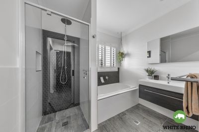 Downstairs, three additional bedrooms, each with built-in robes, are serviced by an ultra-luxe bathroom showcasing designer feature tiles, a vanity, a bathtub, and a rainfall shower.