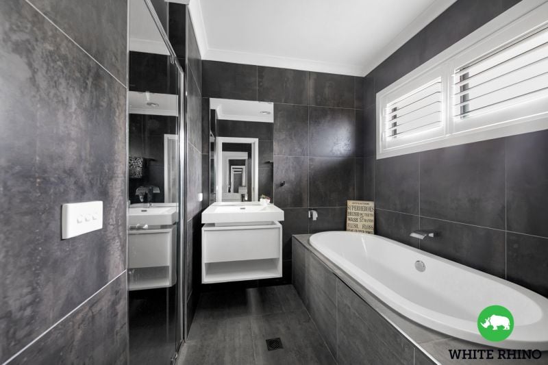 The master suite is a true sanctuary, featuring a striking feature wall, an oversized walk in wardrobe and a luxurious fully tiled ensuite with dual vanities and a large shower. Three additional bedrooms are equally spacious, each with built in wardrobes, while the main bathroom impresses with its sleek design, double vanity, bathtub and separate shower. A separate powder room adds further convenience for guests.