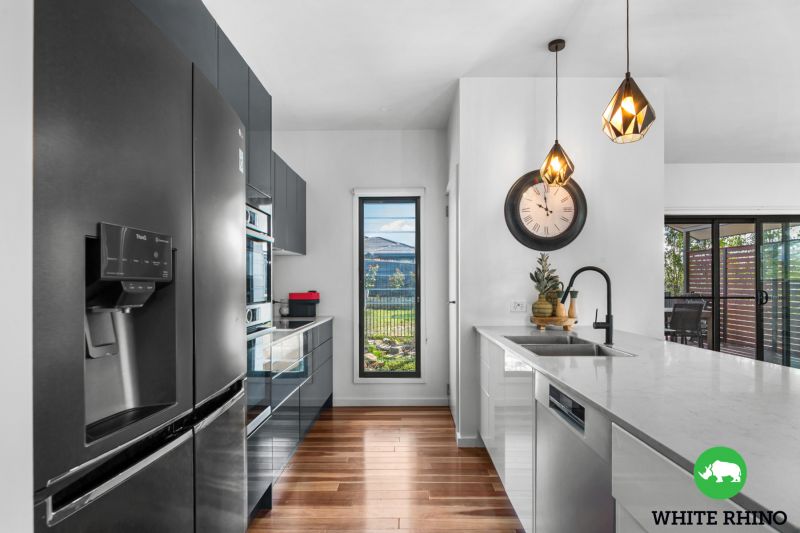 At the heart of the home is a statement kitchen that connects effortlessly with the indoor and outdoor living spaces. Designed to impress, it features stone benchtops, tiled splashbacks, feature pendant lighting and an expansive breakfast bar that flows through to a walk-in pantry. Premium appliances include double ovens, an induction cooktop and a dishwasher, catering perfectly to both everyday living and entertaining.