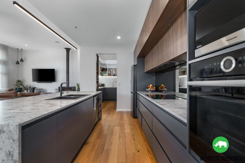 At the heart of the home is the kitchen, a true centrepiece featuring striking cabinetry, premium appliances and a large island bench that is as functional as it is visually impressive. A generous walk-in pantry completes the space, ensuring ease and efficiency for everyday living and entertaining.